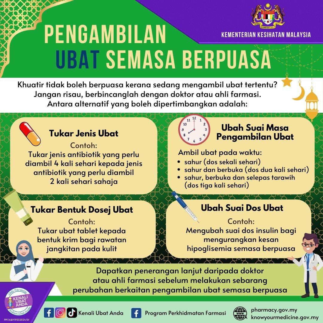 Walau bagaimanapun, bagi pesakit yang ingin berpuasa, dinasihatkan untuk berjumpa doktor dan ahli farmasi terlebih dahulu supaya penerangan dan kaunseling tentang ubat-ubatan dapat diberikan. .Β #kenaliubatanda #knowyourmedicines #qualityuseofmedicines