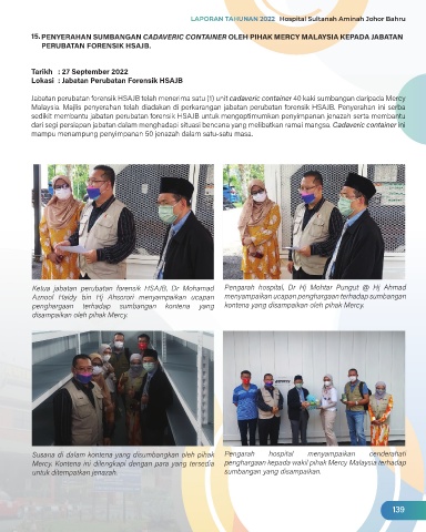 Jabatan perubatan forensik HSAJB telah menerima satu (1) unit cadaveric container 40 kaki sumbangan daripada Mercy