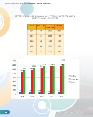 STATISTIK KES PSORIASIS TAHUN 2018 – 2022 JABATAN DERMATOLOGI HOSPITAL SULTANAH AMINAH JOHOR BAHRU TAHUN KES BARU KES JUMLAH ULANGAN 2018 270 2622 2892 2019 258 2892 3166 2020 212 3166 3378 2021 160 3357 3370 2022 233 3368 3601 304