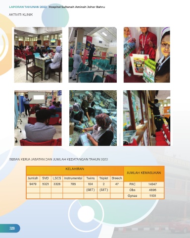 AKTIVITI KLINIK BEBAN KERJA JABATAN DAN JUMLAH KEDATANGAN TAHUN 2022 KELAHIRAN JUMLAH KEMASUKAN Jumlah SVD LSCS Instrumental Twins Triplet Breech 9479 5321 3326 785 104 2 47 PAC 14947 (SET) (SET) Obs 4896 Gynae 11131 328