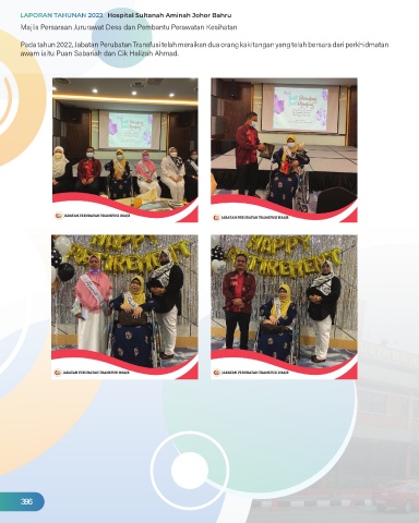 Majlis Persaraan Jururawat Desa dan Pembantu Perawatan Kesihatan Pada tahun 2022, Jabatan Perubatan Transfusi telah meraikan dua orang kakitangan yang telah bersara dari perkhidmatan awam iaitu Puan Sabariah dan Cik Halizah Ahmad. 396