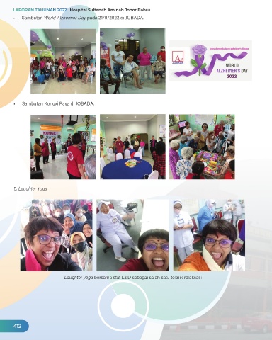 • Sambutan World Alzheimer Day pada 21/9/2022 di JOBADA. • Sambutan Kongxi Raya di JOBADA. 5. Laughter Yoga Laughter yoga bersama staf L&D sebagai salah satu teknik relaksasi 412