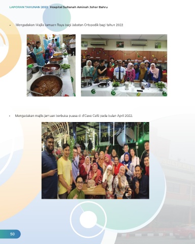 • Mengadakan Majlis Jamuan Raya bagi Jabatan Ortopedik bagi tahun 2022 • Mengadakan majlis jamuan berbuka puasa di d’Cave Café pada bulan April 2022. 50