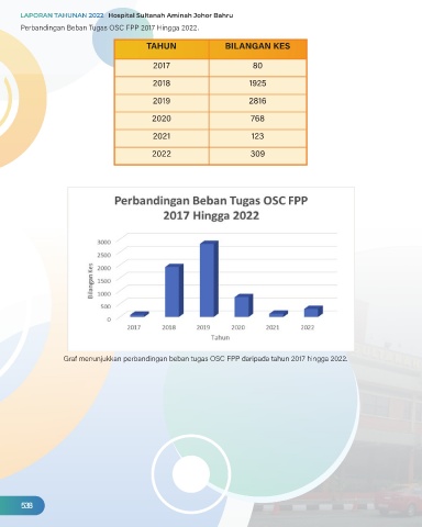 Perbandingan Beban Tugas OSC FPP 2017 Hingga 2022. TAHUN BILANGAN KES 2017 80 2018 1925 2019 2816 2020 768 2021 123 2022 309 Graf menunjukkan perbandingan beban tugas OSC FPP daripada tahun 2017 hingga 2022. 538