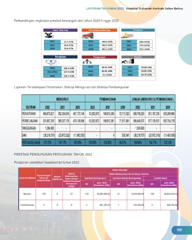 Perbandingan ringkasan prestasi kewangan dari tahun 2020 hingga 2022 Laporan Perbelanjaan Peruntukan Belanja Mengurus dan Belanja Pembangunan PRESTASI PENGURUSAN PEROLEHAN TAHUN 2022 Pelaporan perolehan keseluruhan tahun 2022 581