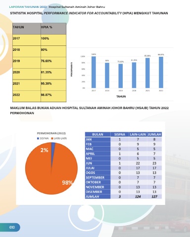 STATISTIK HOSPITAL PERFORMANCE INDICATOR FOR ACCOUNTABILITY (HPIA) MENGIKUT TAHUNAN MAKLUM BALAS BUKAN ADUAN HOSPITAL SULTANAH AMINAH JOHOR BAHRU (HSAJB) TAHUN 2022 PERMOHONAN 610